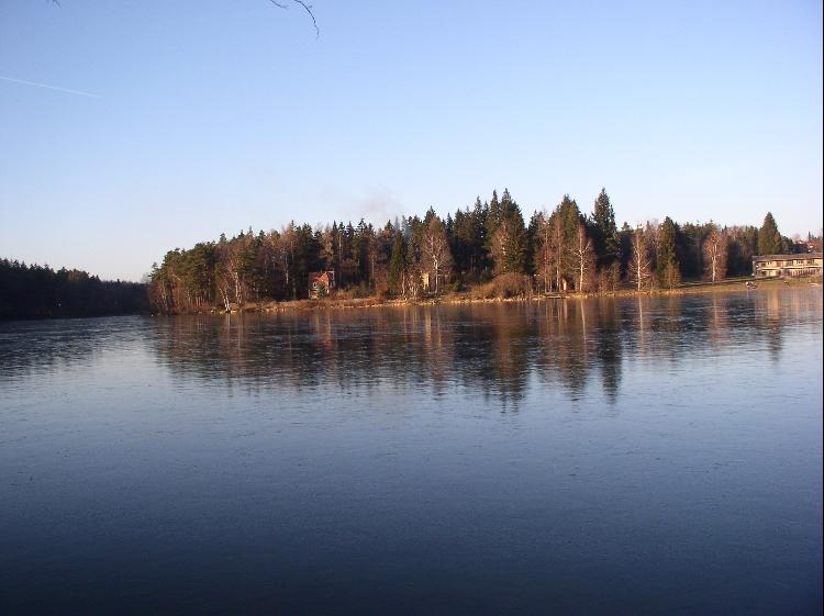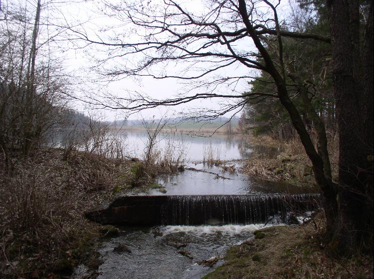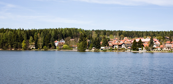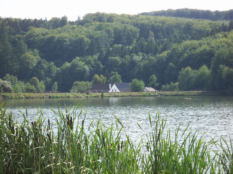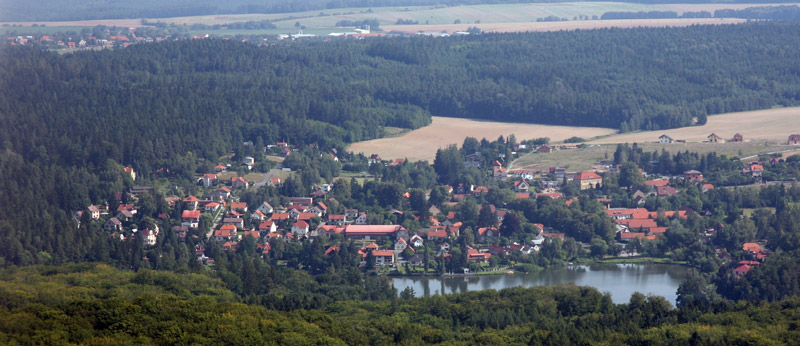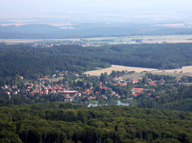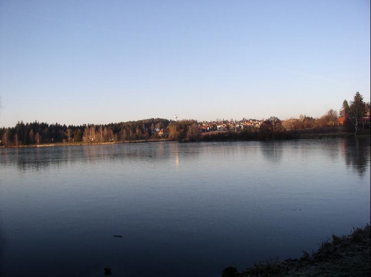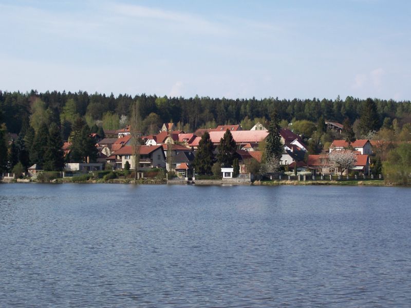 Obec Jevany: pohled od hráze Jevanského rybníka