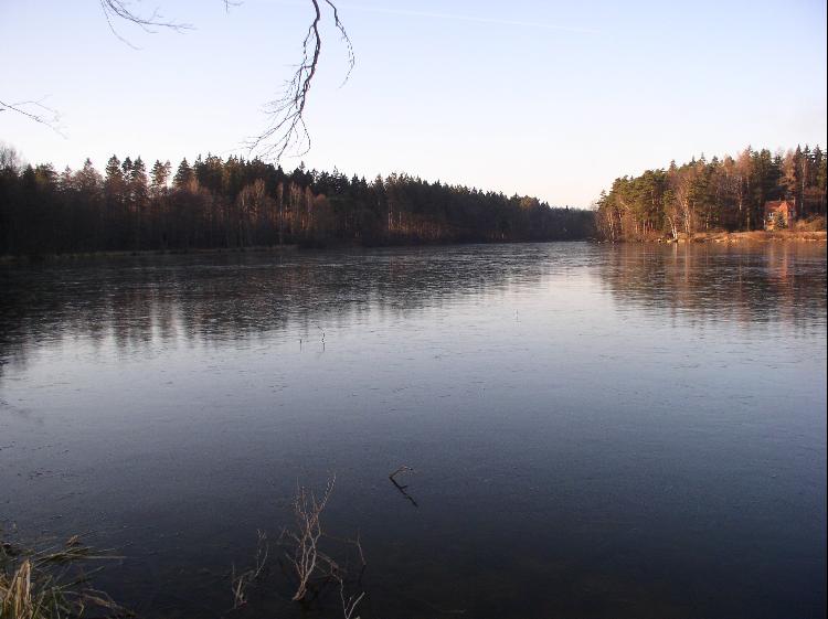 Obec Jevany: pohled od hráze Jevanského rybníka