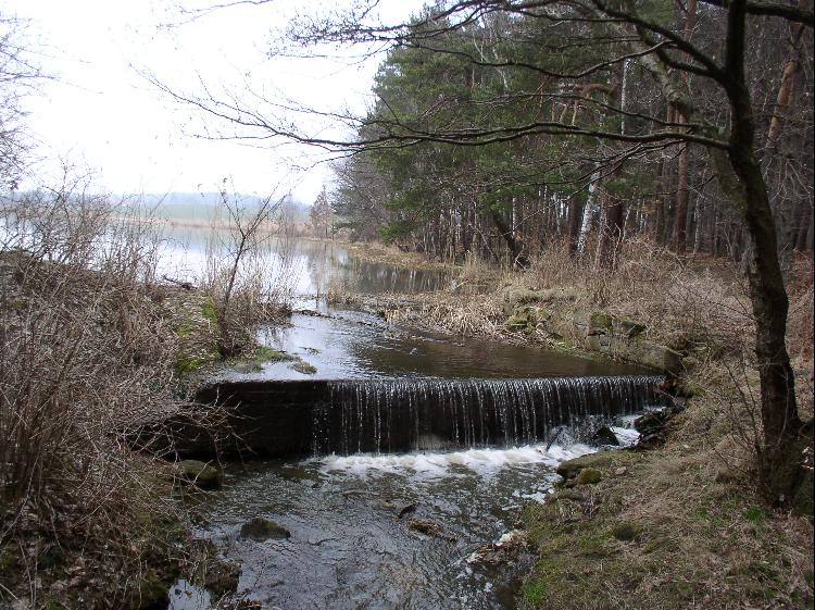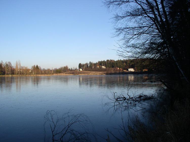 Obec Jevany: pohled od hráze Jevanského rybníka