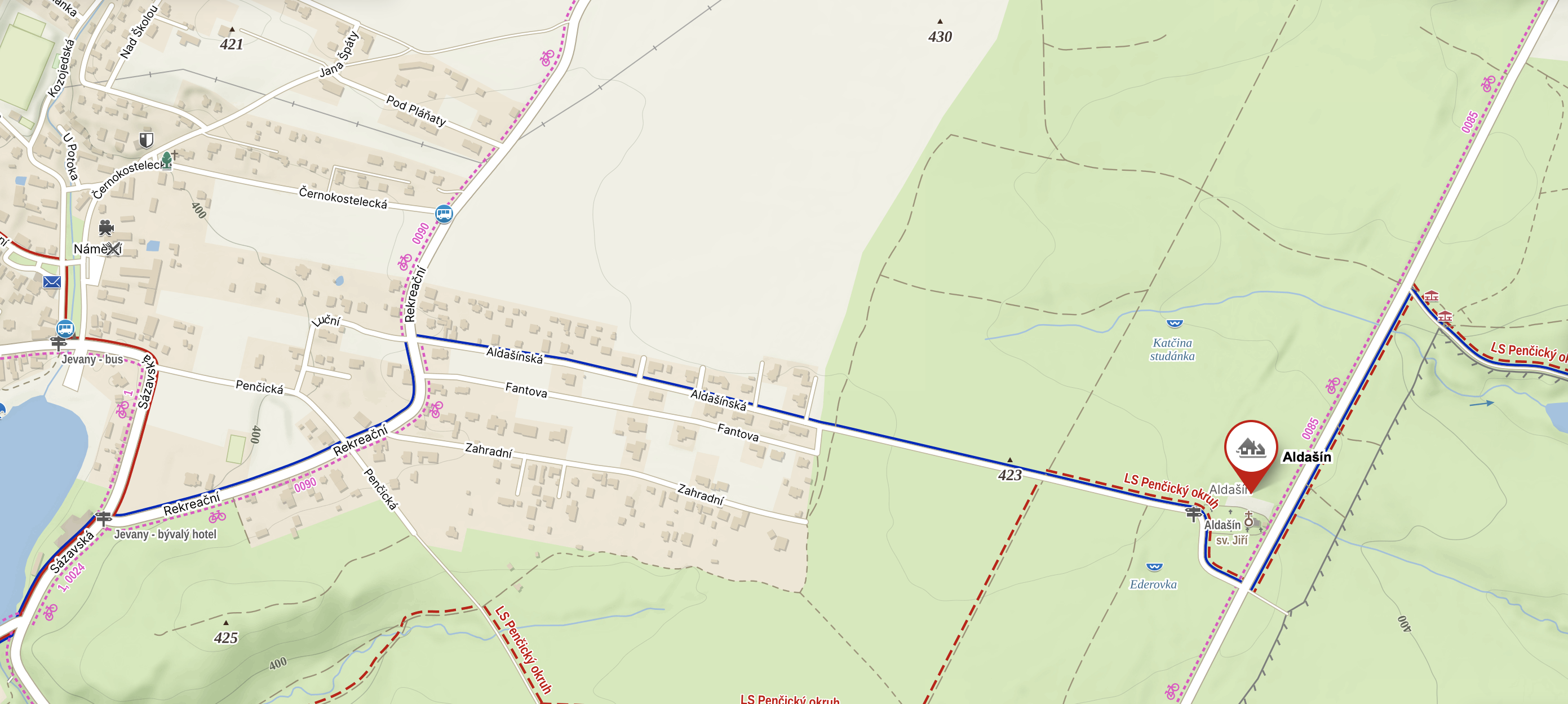Z Aldašína do Kostelce je 4,7 km, do Českého Brodu 16 km, do Jevan 2 km, do Černých Voděrad 3,4 km, do Penčice 2 km. Od aldašínských hřbitovních vrat (za nimi na hřbitově je ve zdi velmi staré hřbitovní znamení) dovede nás utěšená lesní cesta do Jevan.